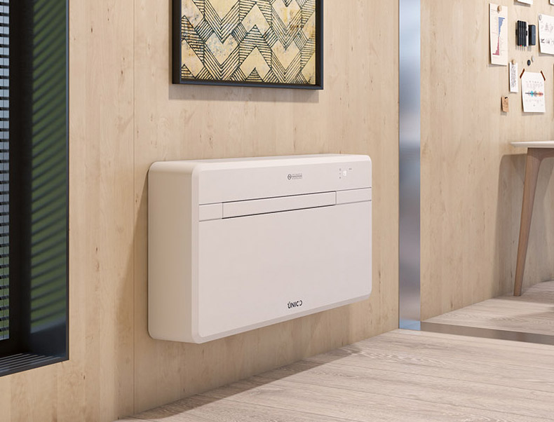 Die patentierte Technologie von Olimpia Splendid ermöglicht es, in einer einzelnen Einheit das zu verbauen, was traditionell auf zwei Einheiten verteilt ist: den außen positionierten Kompressor und das Gehäuse in dem Raum, der zu kühlen ist. Heute steckt die gesamte Technologie von UNICO in einer Dicke von nur 16 cm.
