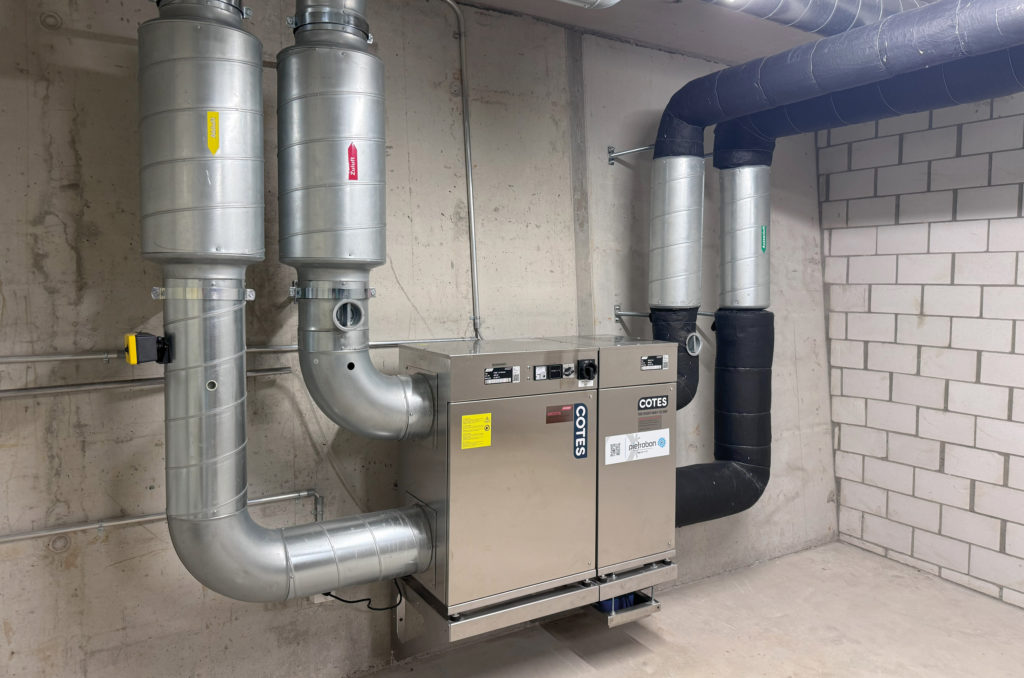 Die Abluft muss zuverlässig abgeführt werden, ohne dass sie wieder angesaugt wird (z. B. durch Zuluft oder Fenster). Deshalb wird sie auf Dachhöhe mit ausreichendem Abstand zur Zuluft ausgeblasen – gemäß den Vorgaben der Lüftungsnormen (SIA, SWKI). Auch Geruch und Lärm spielen eine Rolle.